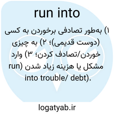۱) به‌طور تصادفی برخوردن به کسی (دوست قدیمی)؛ ۲) به چیزی خوردن/تصادف کردن؛ ۳) وارد مشکل یا هزینه زیاد شدن (run into trouble/ debt).