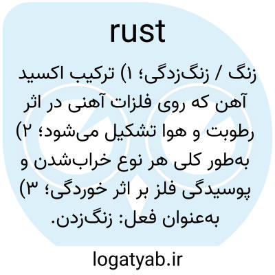 📌 زنگ آهن که به آن زنگ آهن نیز میگویند. پوشش قرمز یا نارنجی رنگی که هنگام قرار گرفتن در معرض هوا و رطوبت روی سطح آهن تشکیل میشود و عمدتاً از هیدروکسید آهن و اکسید آهن تشکیل شده در اثر اکسیداسیون تشکیل شده است.