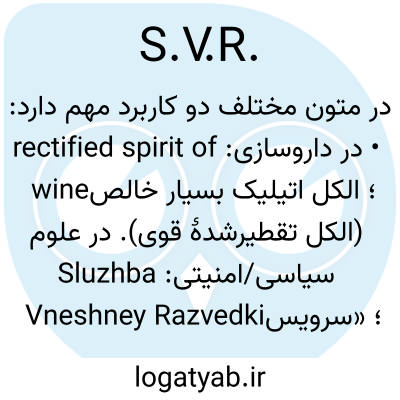 در متون مختلف دو کاربرد مهم دارد: • در داروسازی: rectified spirit of wine؛ الکل اتیلیک بسیار خالص (الکل تقطیرشدهٔ قوی). در علوم سیاسی/امنیتی: Sluzhba Vneshney Razvedki؛ «سرویس اطلاعات خارجی روسیه» (سازمان اطلاعات خارجی فدراسیون روسیه).