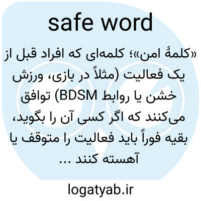 📌 کلمه‌ای که از قبل توافق شده است تا به عنوان علامتی در طول رابطه جنسی، به ویژه رابطه جنسی همراه با اسارت، سلطه یا سادیسم، استفاده شود تا به شریک زندگی خود اطلاع دهد که باید کاری را که انجام می‌دهد متوقف کند.