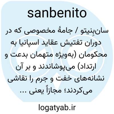 سانبنیتو، san-be-nē′tō، اسم. لباسی که به طرز عجیبی با شعله‌های آتش، شیاطین و غیره تزئین شده بود و قربانیان تفتیش عقاید - در مراسم خود-آزاری - برای توبه یا اعدام در ملاء عام می‌پوشیدند.