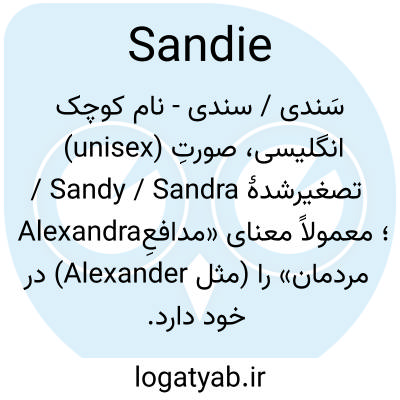 سَندی / سندی - نام کوچک (unisex) انگلیسی، صورتِ تصغیرشدهٔ Sandy / Sandra / Alexandra؛ معمولاً معنای «مدافعِ مردمان» را (مثل Alexander) در خود دارد.