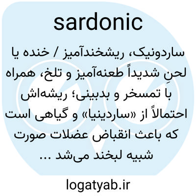 ساردونیک، ریشخندآمیز / خنده یا لحنِ شدیداً طعنه‌آمیز و تلخ، همراه با تمسخر و بدبینی؛ ریشه‌اش احتمالاً از «ساردینیا» و گیاهی است که باعث انقباض عضلات صورت شبیه لبخند می‌شده.