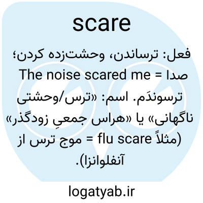 فعل: ترساندن، وحشت‌زده کردن؛ The noise scared me = صدا ترسوندَم. اسم: «ترس/وحشتی ناگهانی» یا «هراس جمعیِ زودگذر» (مثلاً flu scare = موج ترس از آنفلوانزا).