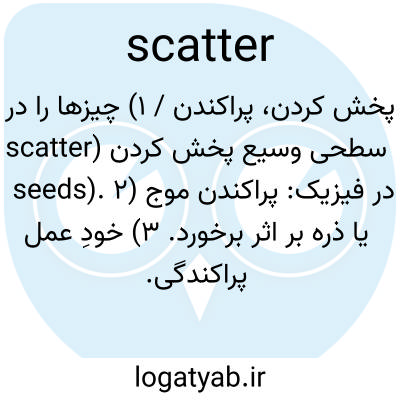 پخش کردن، پراکندن / ۱) چیزها را در سطحی وسیع پخش کردن (scatter seeds). ۲) در فیزیک: پراکندن موج یا ذره بر اثر برخورد. ۳) خودِ عمل پراکندگی.