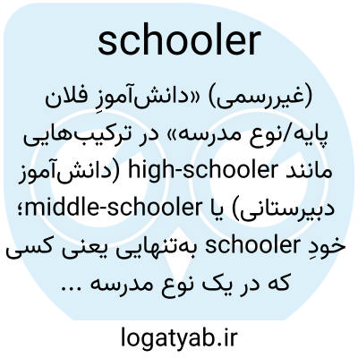 (غیررسمی) «دانش‌آموزِ فلان پایه/نوع مدرسه» در ترکیب‌هایی مانند high-schooler (دانش‌آموز دبیرستانی) یا middle-schooler؛ خودِ schooler به‌تنهایی یعنی کسی که در یک نوع مدرسه درس می‌خواند.