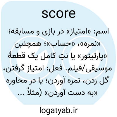 اسم: «امتیاز» در بازی و مسابقه؛ «نمره»، «حساب»؛ همچنین «پارتیتور» یا نتِ کامل یک قطعهٔ موسیقی/فیلم. فعل: امتیاز گرفتن، گل زدن، نمره آوردن؛ یا در محاوره «به دست آوردن» (مثلاً score a job).