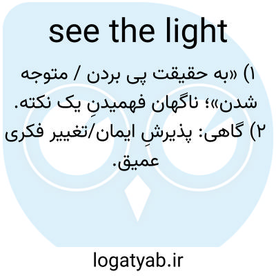 📌 همچنین، شروع به دیدن نور کنید. چیزی را بفهمید یا شروع به فهمیدن کنید؛ همچنین، شایستگی توضیح یا تصمیم دیگری را ببینید. به عنوان مثال، دین پانزده دقیقه سعی داشت آن کسر مالیات را توضیح دهد که بالاخره نور را دیدم، یا پت از اینکه او و دوستانش اجازه نداشتند به تنهایی در کوهستان پیادهروی کنند خشمگین بود، اما وقتی گروهی در آنجا گم شدند، شروع به دیدن نور کرد. این اصطلاح که قدمت آن به اواخر دهه ۱۶۰۰ میلادی برمیگردد، در ابتدا به تغییر مذهب اشاره داشت، نور به معنای «دین واقعی» بود. در اوایل دهه ۱۸۰۰ میلادی، این اصطلاح به طور گستردهتری برای هر نوع فهمی استفاده میشد. همچنین نور را در انتهای تونل ببینید؛ نور روز را ببینید.