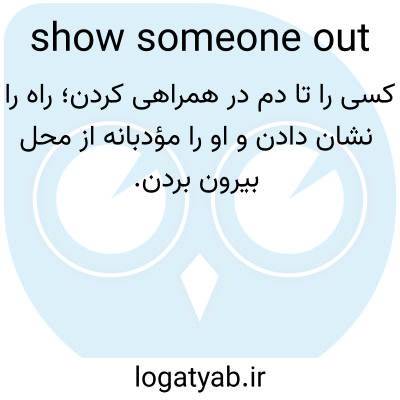 📌 همچنین، کسی را تا دم در راهنمایی کنید. کسی را که در حال خروج است تا دم در همراهی کنید، مانند: «ممنون از آمدنت؛ لطفاً ببخشید که شما را بیرون نیاوردم»، یا «لطفاً آقای اسمیت را تا دم در راهنمایی کنید». [نیمه دوم دهه ۱۷۰۰] همچنین ببینید: «بیرون را نشان بده»، تعریف ۱؛ در را به کسی نشان بده.