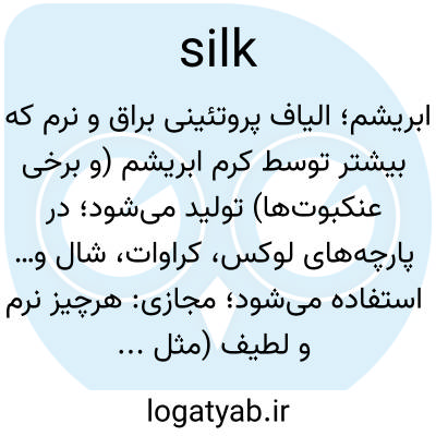 ابریشم؛ الیاف پروتئینی براق و نرم که بیشتر توسط کرم ابریشم (و برخی عنکبوت‌ها) تولید می‌شود؛ در پارچه‌های لوکس، کراوات، شال و… استفاده می‌شود؛ مجازی: هرچیز نرم و لطیف (مثل silky hair).