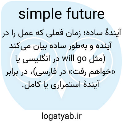 📌 ساختاری فعلی که برای بیان عمل یا حالتی که قرار است در آینده اتفاق بیفتد، استفاده میشود: در انگلیسی، که از ترکیب فعل کمکی will و مصدر یا شکل پایه فعل اصلی ساخته میشود، مانند I will be there soon و We start without you if you're late.
