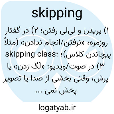 ۱) پریدن و لی‌لی رفتن؛ ۲) در گفتار روزمره، «نرفتن/انجام ندادن» (مثلاً skipping class: پیچاندن کلاس)؛ ۳) در صوت/ویدیو: «لَگ زدن» یا پرش، وقتی بخشی از صدا یا تصویر پخش نمی‌شود.