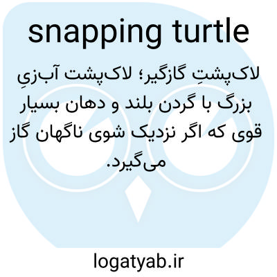 📌 هر یک از دو لاکپشت بزرگ، خوراکی و آب شیرین از خانوادهی Chelydridae، از آمریکای شمالی و مرکزی، که سری بزرگ و آروارههای قلابدار قدرتمندی دارند، به ویژه لاکپشت گازگیر معمولی، Chelydra serpentina.