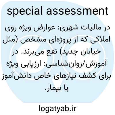 در مالیات شهری: عوارض ویژه روی املاکی که از پروژه‌ای مشخص (مثل خیابان جدید) نفع می‌برند. در آموزش/روان‌شناسی: ارزیابی ویژه برای کشف نیازهای خاص دانش‌آموز یا بیمار.
