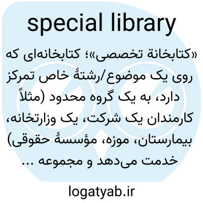 📌 کتابخانه‌ای که توسط یک سازمان، به عنوان یک کسب و کار، انجمن یا آژانس دولتی، برای جمع‌آوری مطالب و ارائه اطلاعات مرتبط با کار آن سازمان، نگهداری می‌شود.