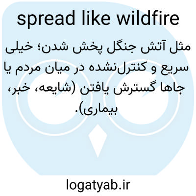 📌 خیلی سریع پخش یا منتشر شدن، مانند «شایعه طلاق آنها مانند آتش وحشی پخش شد». اسم آتش وحشی به معنای «آتشسوزی مهیب و سریعاً در حال گسترش» است. [حدود ۱۸۰۰]
