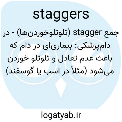 جمع stagger (تلوتلوخوردن‌ها) - در دام‌پزشکی: بیماری‌ای در دام که باعث عدم تعادل و تلوتلو خوردن می‌شود (مثلاً در اسب یا گوسفند)