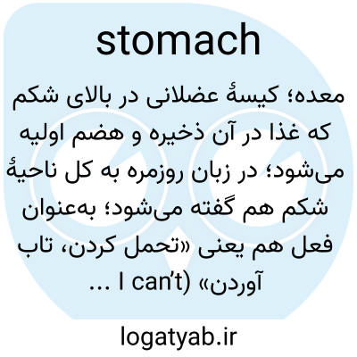 معده؛ کیسهٔ عضلانی در بالای شکم که غذا در آن ذخیره و هضم اولیه می‌شود؛ در زبان روزمره به کل ناحیهٔ شکم هم گفته می‌شود؛ به‌عنوان فعل هم یعنی «تحمل کردن، تاب آوردن» (I can’t stomach that).