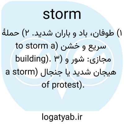 ۱) طوفان، باد و باران شدید. ۲) حملهٔ سریع و خشن (to storm a building). ۳) مجازی: شور و هیجان شدید یا جنجال (a storm of protest).