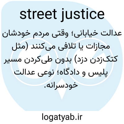 عدالت خیابانی؛ وقتی مردم خودشان مجازات یا تلافی می‌کنند (مثل کتک‌زدن دزد) بدون طی‌کردن مسیر پلیس و دادگاه؛ نوعی عدالت خودسرانه.