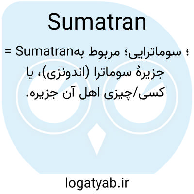 = Sumatran؛ سوماترایی؛ مربوط به جزیرهٔ سوماترا (اندونزی)، یا کسی/چیزی اهل آن جزیره.