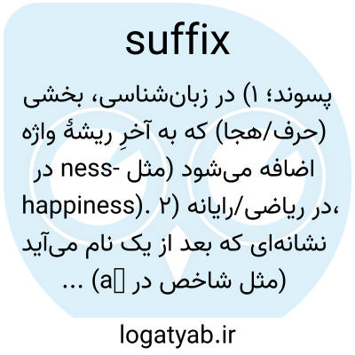 پسوند؛ 1) در زبان‌شناسی، بخشی (حرف/هجا) که به آخرِ ریشهٔ واژه اضافه می‌شود (مثل -ness در happiness). 2) در ریاضی/رایانه، نشانه‌ای که بعد از یک نام می‌آید (مثل شاخص در a₁).