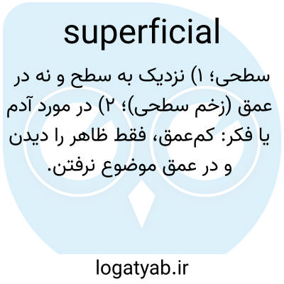 سطحی؛ ۱) نزدیک به سطح و نه در عمق (زخم سطحی)؛ ۲) در مورد آدم یا فکر: کم‌عمق، فقط ظاهر را دیدن و در عمق موضوع نرفتن.