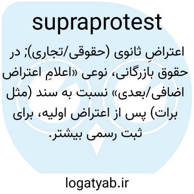 سوپراپروتست، sū-pra-prō′test، اسم: پذیرش یا پرداخت برات، توسط کسی که طرف آن نبوده، پس از اعتراض به عدم پذیرش یا عدم پرداخت.