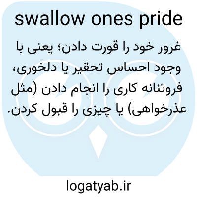 📌 فروتنی کردن، مانند عبارت «او تصمیم گرفت غرورش را کنار بگذارد و عذرخواهی کند». این اصطلاح، کلمه swallow را به معنای «خودداری از ابراز» به کار می‌برد، کاربردی که قدمت آن به اوایل دهه ۱۶۰۰ میلادی برمی‌گردد.