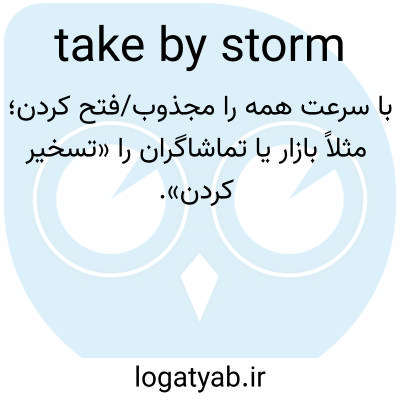 📌 تأثیر واضحی بر جای گذاشتن، به سرعت تحسین یا شهرت عمومی کسب کردن، مانند گروه راک جدید که شهر را طوفانی تصرف کرد. این کاربرد، معنای نظامی اصلی عبارت، «یورش در یک حمله خشونتآمیز»، را به تلاشهای صلحآمیزتر منتقل میکند. [اواسط دهه ۱۸۰۰]