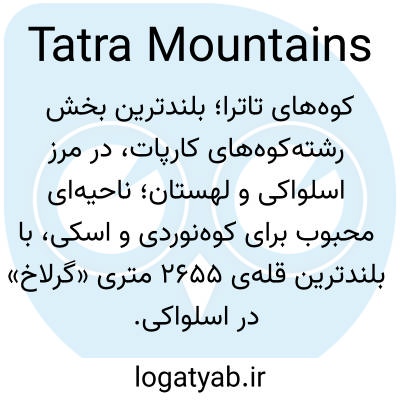 کوه‌های تاترا؛ بلندترین بخش رشته‌کوه‌های کارپات، در مرز اسلواکی و لهستان؛ ناحیه‌ای محبوب برای کوه‌نوردی و اسکی، با بلندترین قله‌ی ۲۶۵۵ متری «گرلاخ» در اسلواکی.