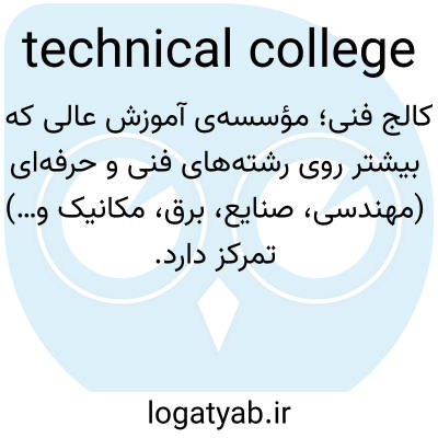 📌 گاهی اوقات (غیررسمی) به صورت خلاصه: tech. موسسهای برای آموزش عالی که دورههایی در زمینه فناوری، هنر، مهارتهای منشیگری، کشاورزی و غیره ارائه میدهد.