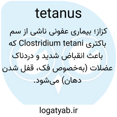 📌 آسیب‌شناسی، یک بیماری عفونی و اغلب کشنده ناشی از یک باکتری خاص که از طریق زخم‌ها وارد بدن می‌شود و با فلج تنفسی و اسپاسم‌های تونیک و سفتی عضلات ارادی، به ویژه عضلات گردن و فک پایین مشخص می‌شود.