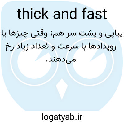 📌 به سرعت در حال ازدحام، آنقدر سریع که با هم میدوند، مانند عبارت «سوالات با سرعت و فشردگی به او رسیدند». این اصطلاح در نیمه دوم دهه ۱۵۰۰ میلادی با عنوان «ضخیم و سهگانه» پدید آمد و حدود سال ۱۷۰۰ با نسخه فعلی جایگزین شد. برای مترادف، به «سریع و خشمگین» مراجعه کنید.