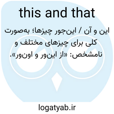 📌 همچنین، این، آن و آن چیز دیگر. موارد متفرقه مختلف، یک چیز و آن چیز دیگر، مانند «او این و آن را در مورد بودجه گفت، اما هیچ چیز جدید یا مهمی نبود»، یا «ما تمام شب را صرف گپ زدن در مورد این، آن و آن چیز کردیم». اولین اصطلاح برای اولین بار در سال ۱۵۸۱ ثبت شد؛ نوع دیگر آن به اوایل دهه ۱۹۰۰ برمیگردد.