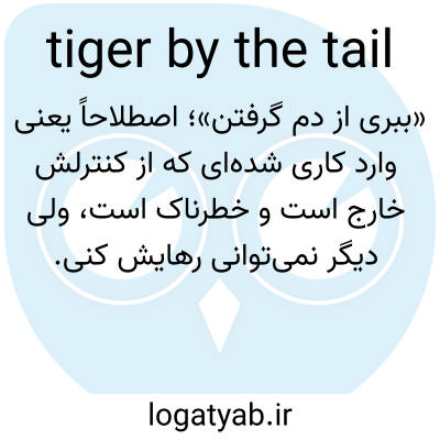 📌 چیزی که مدیریت یا کنار آمدن با آن بسیار دشوار است، مانند این جمله: «شما چیزی در مورد بازار کالاها نمیدانید؛ در نهایت یک ببر را از دم خواهید گرفت». این استعاره رنگارنگ، تصویری از گرفتن یک حیوان قدرتمند اما درنده از دم را تداعی میکند، اما در نهایت به یکی از آنها حمله میکند. [نیمه دوم دهه 1900]