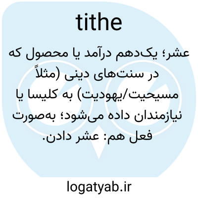 📌 گاهی اوقات عشر. دهمین بخش از محصولات کشاورزی یا درآمد شخصی که به عنوان نذورات به خدا یا برای کارهای رحمت اختصاص داده می‌شود، یا همان مبلغی که به عنوان تعهد یا مالیات برای حمایت از کلیسا، کشیش یا موارد مشابه در نظر گرفته می‌شود.