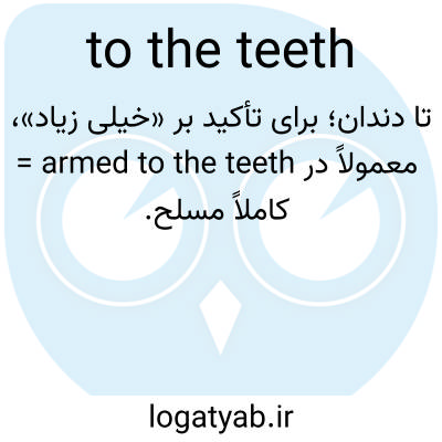 📌 همچنین، ... کاملاً متعهد، مانند عبارت «ما تا دندان در این همکاری هستیم». [نیمه اول دهه 1900] هر دوی این کاربردهای اغراقآمیز به این اشاره دارند که کاملاً در چیزی غرق شده یا تا دندان در آن فرو رفته باشیم.