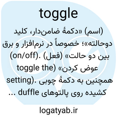 (اسم) «دکمهٔ ضامن‌دار، کلید دوحالته»؛ خصوصاً در نرم‌افزار و برق (on/off). (فعل) «بین دو حالت عوض کردن» (toggle the setting). همچنین به دکمهٔ چوبی کشیده روی پالتوهای duffle coat هم toggle می‌گویند.