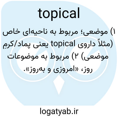 📌 پزشکی/دارویی. مربوط به، مربوط به، یا اعمال شده به صورت خارجی بر روی قسمت خاصی از بدن؛ موضعی.