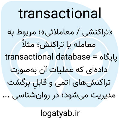 «تراکنشی / معاملاتی»؛ مربوط به معامله یا تراکنش؛ مثلاً transactional database = پایگاه داده‌ای که عملیات آن به‌صورت تراکنش‌های اتمی و قابلِ برگشت مدیریت می‌شود؛ در روان‌شناسی هم در ترکیب‌هایی مثل transactional analysis می‌آید.