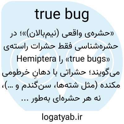 «حشره‌ی واقعی (نیم‌بالان)»؛ در حشره‌شناسی فقط حشرات راسته‌ی Hemiptera را «true bugs» می‌گویند؛ حشراتی با دهانِ خرطومی مکنده (مثل شته‌ها، سن‌گندم و …)، نه هر حشره‌ای به‌طور عام.