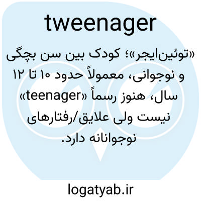«توئین‌ایجر»؛ کودک بین سن بچگی و نوجوانی، معمولاً حدود ۱۰ تا ۱۲ سال، هنوز رسماً «teenager» نیست ولی علایق/رفتارهای نوجوانانه دارد.