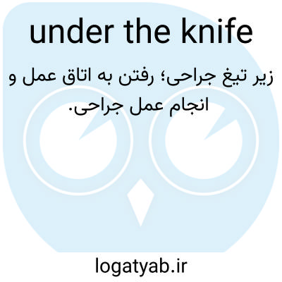 📌 تحت عمل جراحی قرار گرفتن، مانند جملهی «او تمام مدتی که زیر چاقو بود بیدار بود». این عبارت اغلب به صورت go under the knife به معنای «عمل جراحی شدن» بیان میشود، مانند جملهی «چه زمانی زیر چاقو میروید؟» Knife که به معنای «جراحی» است، اولین بار در سال ۱۸۸۰ ثبت شد.