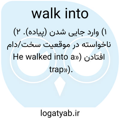 ۱) وارد جایی شدن (پیاده). ۲) ناخواسته در موقعیت سخت/دام افتادن («He walked into a trap»).