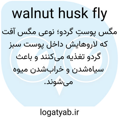 📌 هر یک از چندین مگس میوه، مانند Rhagoletis completa، که لاروهای آنها از پوسته گردو تغذیه کرده و آن را تغییر رنگ می‌دهند.