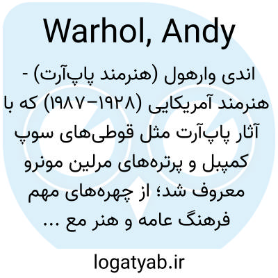 📌 هنرمند آمریکایی قرن بیستم که شناختهشدهترین اثرش تصویر بزرگشده و دقیقی از یک قوطی سوپ گوجهفرنگی کمپبل بود. او همچنین بطریهای کوکاکولا، پدهای بریلو و ردیفهایی از تصاویر مرلین مونرو را نقاشی کرد. (همچنین به هنر پاپ مراجعه کنید.)