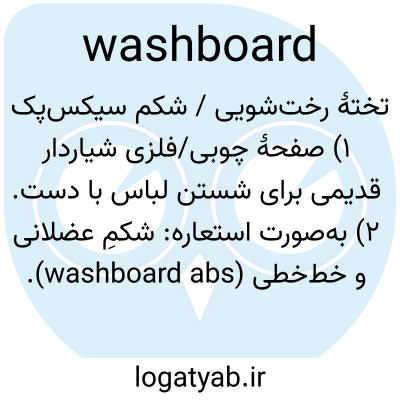 تختهٔ رخت‌شویی / شکم سیکس‌پک ۱) صفحهٔ چوبی/فلزی شیاردار قدیمی برای شستن لباس با دست. ۲) به‌صورت استعاره: شکمِ عضلانی و خط‌خطی (washboard abs).
