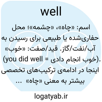 اسم: «چاه»، «چشمه»؛ محل حفاری‌شده یا طبیعی برای رسیدن به آب/نفت/گاز. قید/صفت: «خوب» (you did well = خوب انجام دادی). اینجا در ادامه‌ی ترکیب‌های تخصصی بیشتر به معنی «چاه» است.