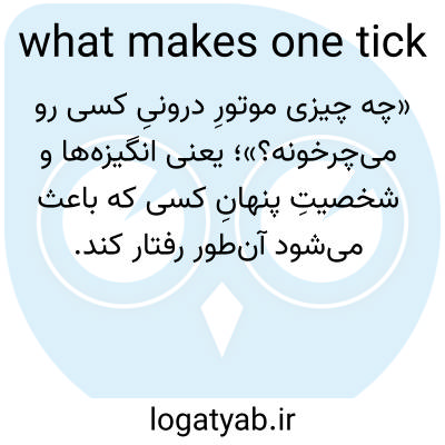 📌 چه چیزی باعث میشود که یک نفر به طور مشخص عمل کند، چه چیزی او را انگیزه میدهد، مانند جملهی «ما هرگز نفهمیدهایم چه چیزی باعث میشود این بازیکنان شطرنج تیک بزنند». این عبارت به تیک زدن به معنای «عملکرد به عنوان یک مکانیسم عملیاتی، مانند یک ساعت» اشاره دارد. [عامیانه؛ نیمه اول دهه 1900]